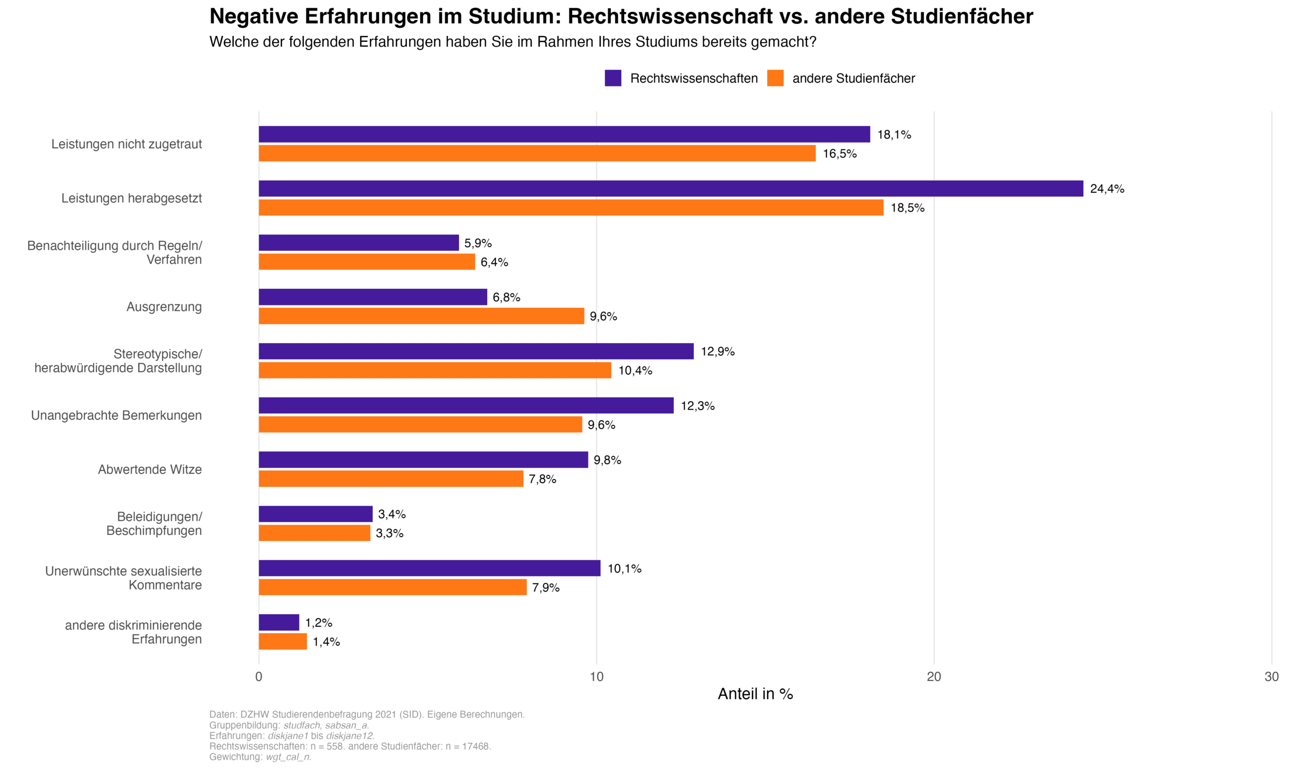 Bei 7 von 10 der auswertbaren Erfahrungskategorien berichten die Studierenden der Rechtswissenschaften häufiger von negativen Erfahrungen als Studierende anderer Fächer. Die Unterschiede sind dabei überwiegend im niedrigen einstelligen Prozentbereich. Der deutlichste Unterschied zeigt sich bei der Herabsetzung von Leistungen mit 24 % bei den Rechtswissenschaften und 18,5 % bei den anderen Studienfächern – ein Delta von 5,9 %. Auch bei unangebrachten Bemerkungen, stereotypischen Darstellungen und sexualisierten Kommentaren liegen die Rechtswissenschaften jeweils mehr als zwei Prozentpunkte vor den anderen Studienfächern. Hingegen berichten weniger Studierende der Rechtswissenschaften von Ausgrenzungserfahrungen.