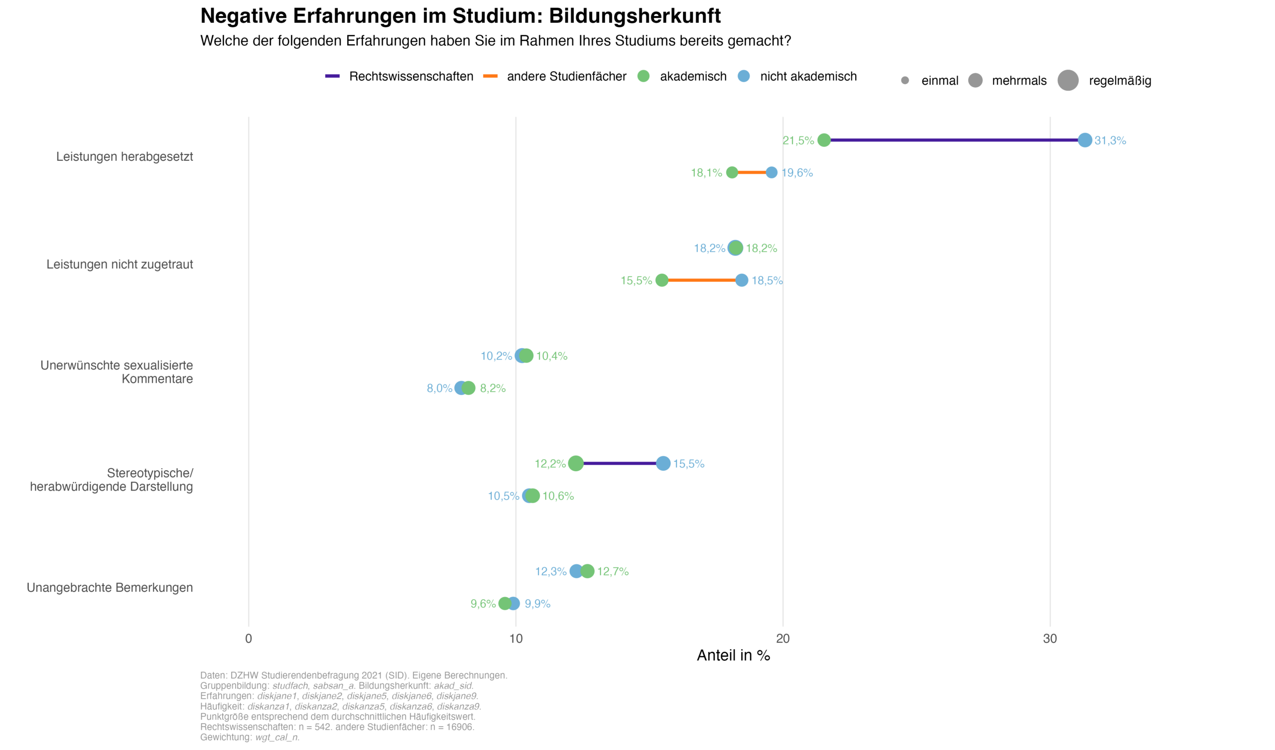 Die Auswertung fügt sich in die bestehende Literatur zur Erfahrung von weiblichen Studierenden nicht nur in den Rechtswissenschaften ein. Bemerkenswert ist jedoch, dass die Rechtswissenschaften besonders schlecht abschneiden; die Gründe hierfür sind weiter zu erforschen. Für Studierende mit Migrationshintergrund zeigen sich quantitative Befunde, die sich in ein gesamtgesellschaftliches Bild zur Diskriminierung einfügen und sich mit (qualitativen) Erfahrungsberichten von Rechtswissenschaftler:innen decken. Dabei fehlt jedoch eine hinreichend breite Datenbasis, um zwischen den Erfahrungen im Studium der Rechtswissenschaften und anderen Studienfächern überzeugend zu differenzieren; es zeigt sich einmal mehr das bestehende Forschungsdesiderat: Wir brauchen mehr Daten. Bei Studierenden aus nicht-akademischen Haushalten zeigt sich, dass die Unterschiede hauptsächlich auf Leistungswahrnehmung beruhen. Schon dies ist ein Weckruf für Lehrende, ihre Leistungsbewertungen fair und transparent zu gestalten.