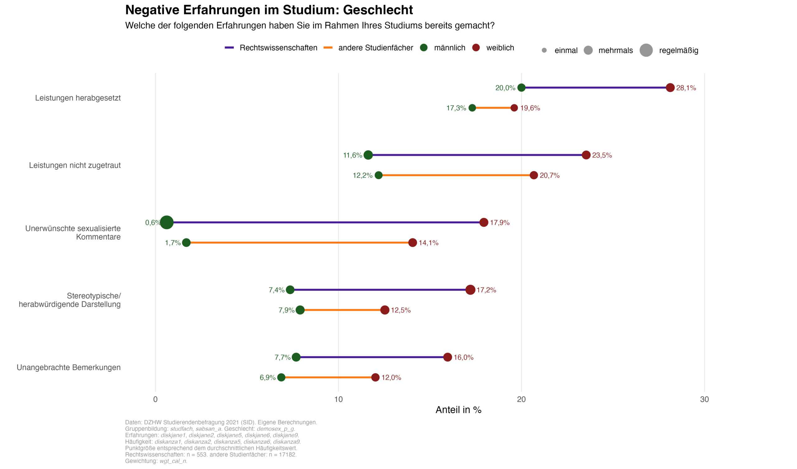 In beiden Gruppen sowie über alle Erfahrungskategorien berichten weibliche Studierende häufiger von negativen Erfahrungen als männliche Studierende. Der Unterschied ist besonders deutlich bei unerwünschten sexualisierten Kommentaren: Nur 0,6 % der männlichen Studierenden der Rechtswissenschaften berichten von solchen Vorfällen, während der Anteil bei weiblichen Studierenden bei 17,9 % liegt. Dies spiegelt sich auf niedrigerem Niveau bei den anderen Studienfächern. Bei den Rechtswissenschaften scheint es sich bei den sexualisierten Kommentaren gegenüber männlichen Studierenden um Einzelfälle zu handeln, welche dann jedoch bei der Person regelmäßig auftreten. Eine weitere Auffälligkeit ist, dass Studierende der Rechtswissenschaften insgesamt häufiger und weibliche Studierende im Besonderen (28,1 %) davon berichten, dass ihre Leistungen herabgesetzt wurden. Ähnlich starke Unterschiede zeigen sich bei stereotypen Darstellungen; hier liegt der Unterschied zwischen männlichen und weiblichen Studierenden der Rechtswissenschaften bei fast 10 %. Bei der Herabsetzung von Leistungen, den stereotypen Darstellungen wie auch den unangebrachten Bemerkungen liegen die Rechtswissenschaften deutlich vor den anderen Studienfächern.
