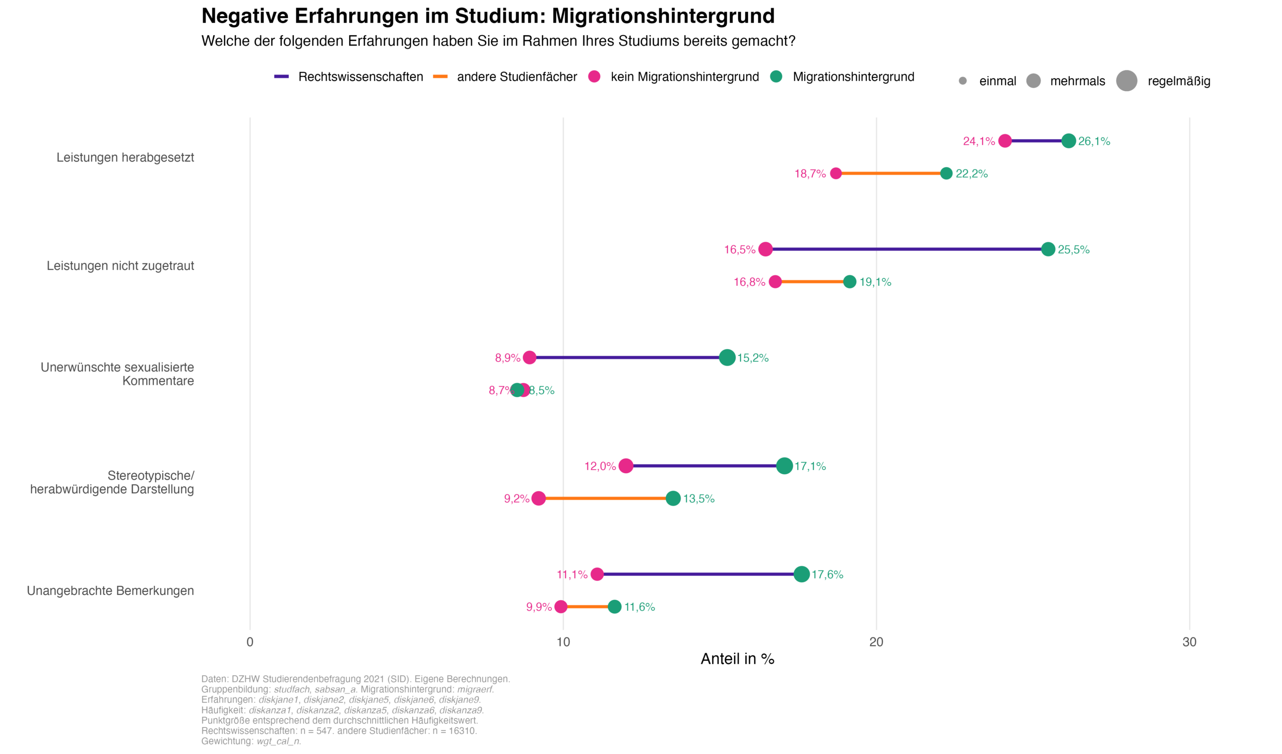 Studierende mit Migrationshintergrund berichten in fast allen Kategorien häufiger von negativen Erfahrungen als Studierende ohne Migrationshintergrund; die Rechtswissenschaften liegen dabei auch in allen betrachteten Kategorien vor den anderen Studienfächern. Etwa 25,5 % der Studierenden mit Migrationshintergrund in den Rechtswissenschaften geben an, dass ihnen Leistungen nicht zugetraut wurden, gegenüber 16,5 % der Studierenden ohne Migrationshintergrund. Auch bei stereotypen oder herabwürdigenden Darstellungen, bei unangebrachten Bemerkungen sowie bei sexualisierten Kommentaren berichten Studierende mit Migrationshintergrund mit jeweils um die 5 Prozentpunkten häufiger von entsprechenden Erfahrungen.